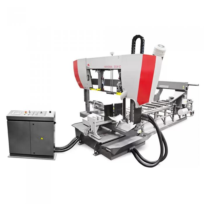 A fully automatic band saw of a twin-column construction, designed also for double-sided mitre cuts. The outstanding cutting power of the machine results from the following features: a three-sided hardmetal band precision guide, a saw arm laid both-sided on preloaded linear guides, a 41 mm high saw band and lastly, a synchronous running brush for chips disposal. Material downfeed is controlled electromechanically, while material clamping and arm down- feed are controlled hydraulically.