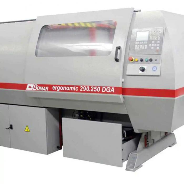 The Bomar Ergonomic 290.250DGA is an automatic two-way mitre-cutting bandsaw (–45° to +60°) and is a fully NC controlled machine. It is designed for automated medium to high quantity cutting of steel sections with straight and mitre cuts.
