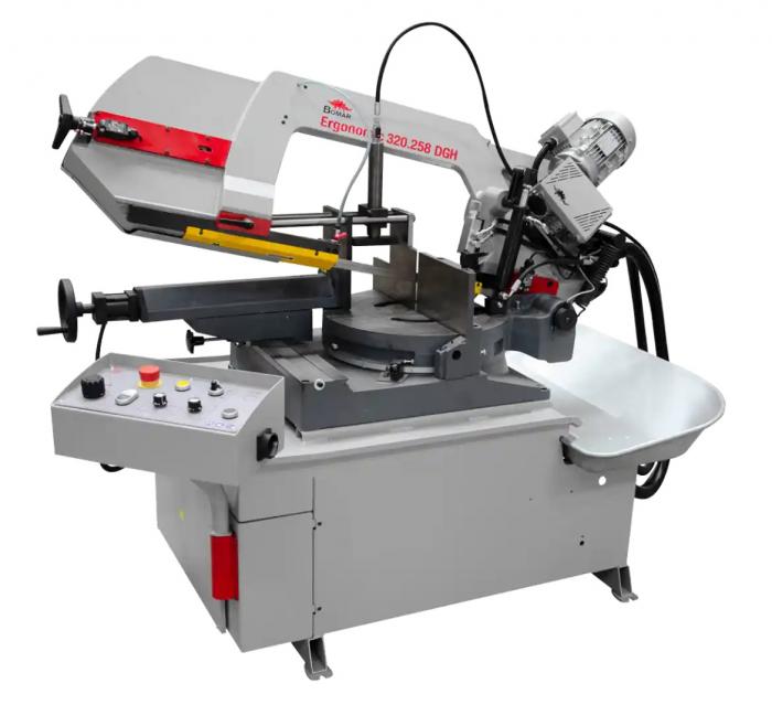 The ALL NEW Bomar Ergonomic 320.258DGH is a semi automatic mitre bandsaw ideal for the general fabricator or production of steel structures. Mitre cutting in both directions to 45° left 60° right with a large easy-to-read mitre scale. This machine also has variable blade speed to cope with a wide variety of cutting applications. There is also a hydraulic clamping device with a short stroke hydraulic cylinder.